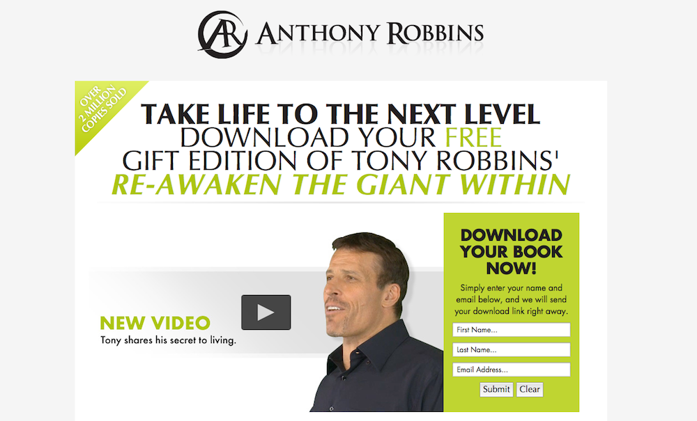 Free eBooks make fantastic lead magnets. Maybe you just published a book in print format and you want to promote it with a free eBook version, or you create an eBook specifically as a lead magnet for your list. Of course, Tony Robbins has a stellar eBook lead magnet.