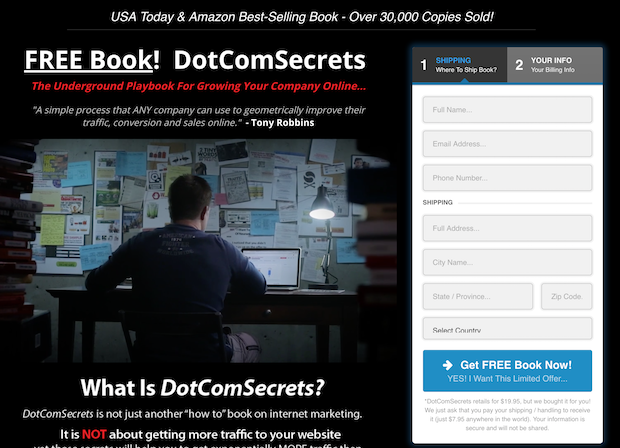 “DotComSecrets” goes old school with a free book shipped right to anyone who subscribes. All they have to pay is the shipping costs.