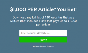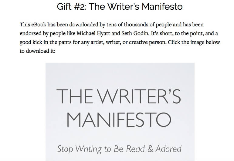 A resource list can be a starter kit, a glossary, templates, a list of resources. The example above shows a lead magnet for writers that includes a list of over a hundred websites that pay writers.